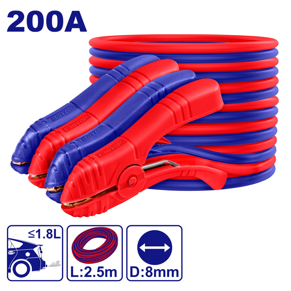 Pinces de Câble 200 Ampères – Taille de la Pince : 15.6 x 9.1 cm – Câble en Aluminium Enduit de Cuivre – Diamètre Extérieur du Câble : 8 mm – Longueur du Câble : 2,5 m – Adapté aux Émissions ≤ 1,8 L – Emballé dans une Boîte de Couleur