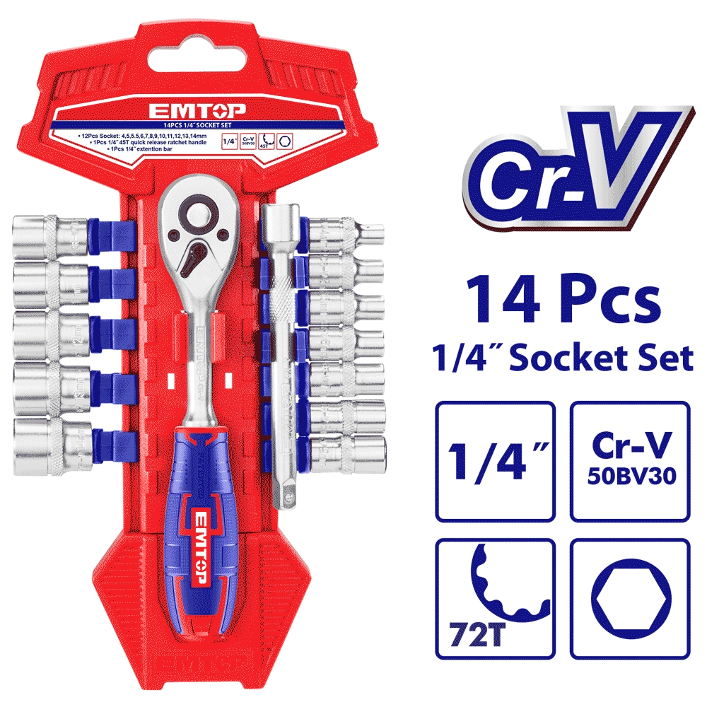 JEU 14 DOUILLES 1/4″ AVEC CLIQUET EMTOP ESKT14141